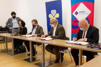 citydev.brussels et 400 toits renouvellent leur partenariat avec six nouveaux habitats modulaires pour sans-abris rue de Barcelone à Forest.